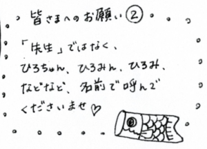 「先生」ではなく、ひろちゃん、ひろみん、ひろみ、などなど、名前で呼んでくださいませ♡