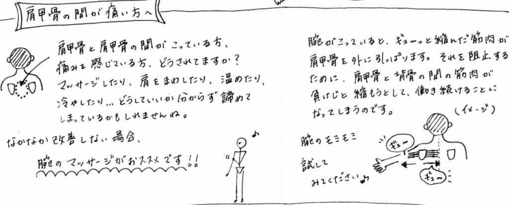 さて、今回のメインテーマは「肩甲骨の間の痛み」についてでした。