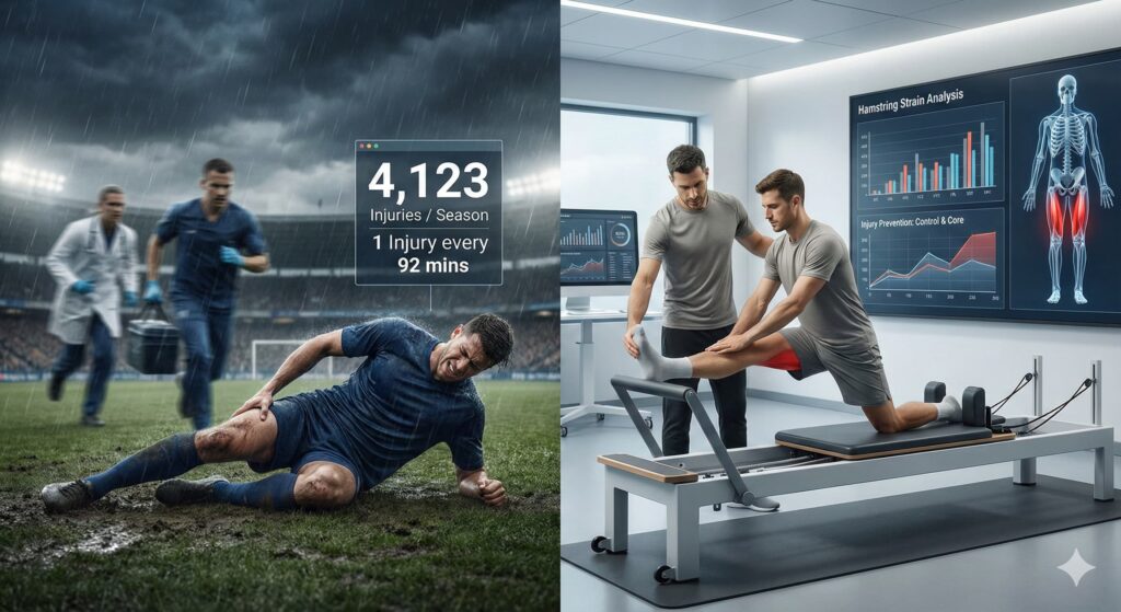 この膨大な怪我の中で、ピラティス経験者として注目せずにはいられないデータがあります。 ラ・リーガ(スペイン)を含むプロリーグの研究によると、全傷害の約24%、つまり4回に1回の怪我は「ハムストリングス(太ももの裏)」の肉離れなどの筋損傷が占めているのです。